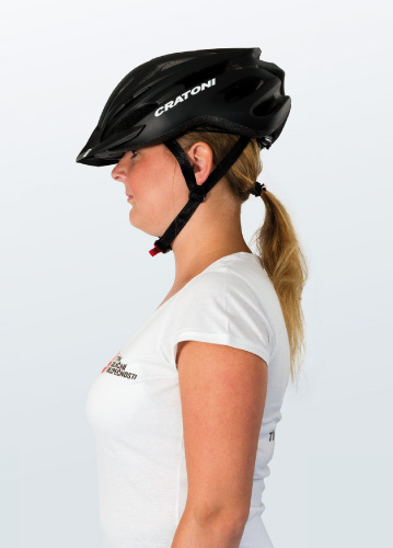 Cyklistka má špatně seřízené řemínky cyklistické přilby. Řemínky vedoucí před a za uchem by se měly setkat pod ušním boltcem. Utažení řemínků pod bradou je příliš volné. Doporučení je takové, že mezi řemínek a bradu by se měly vejít dva prsty.
